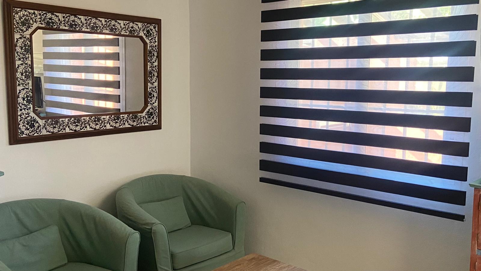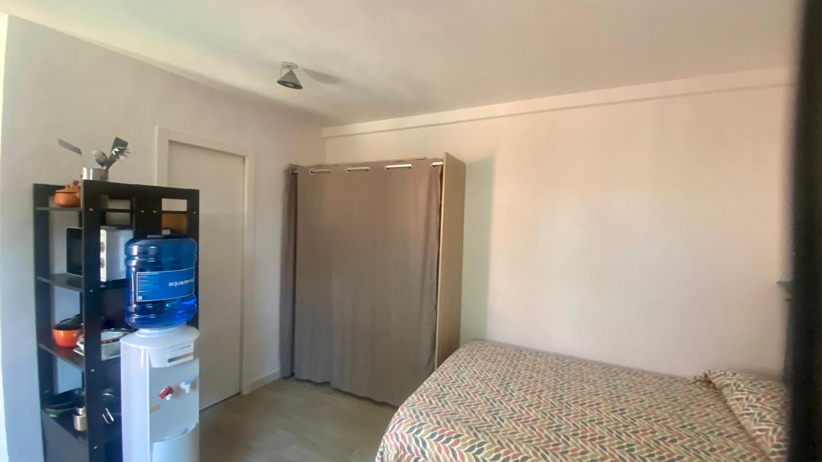 Dispone en una misma estancia de cama de matrimonio de 1,35 cm, armario para la ropa, zona de estar con butacas y mesa, office con frigorífico bajo encimera. Cuarto de baño con placa de ducha. Tiene aire acondicionado frio/calor, televisión, WiFi, dispensador de agua mineral, microondas y menaje de cocina básico. Se entrega con sábanas y toallas.