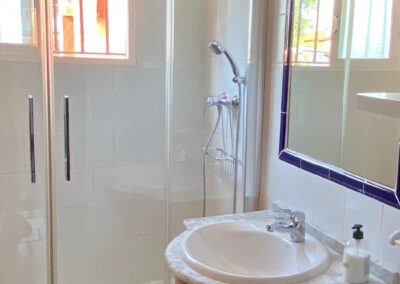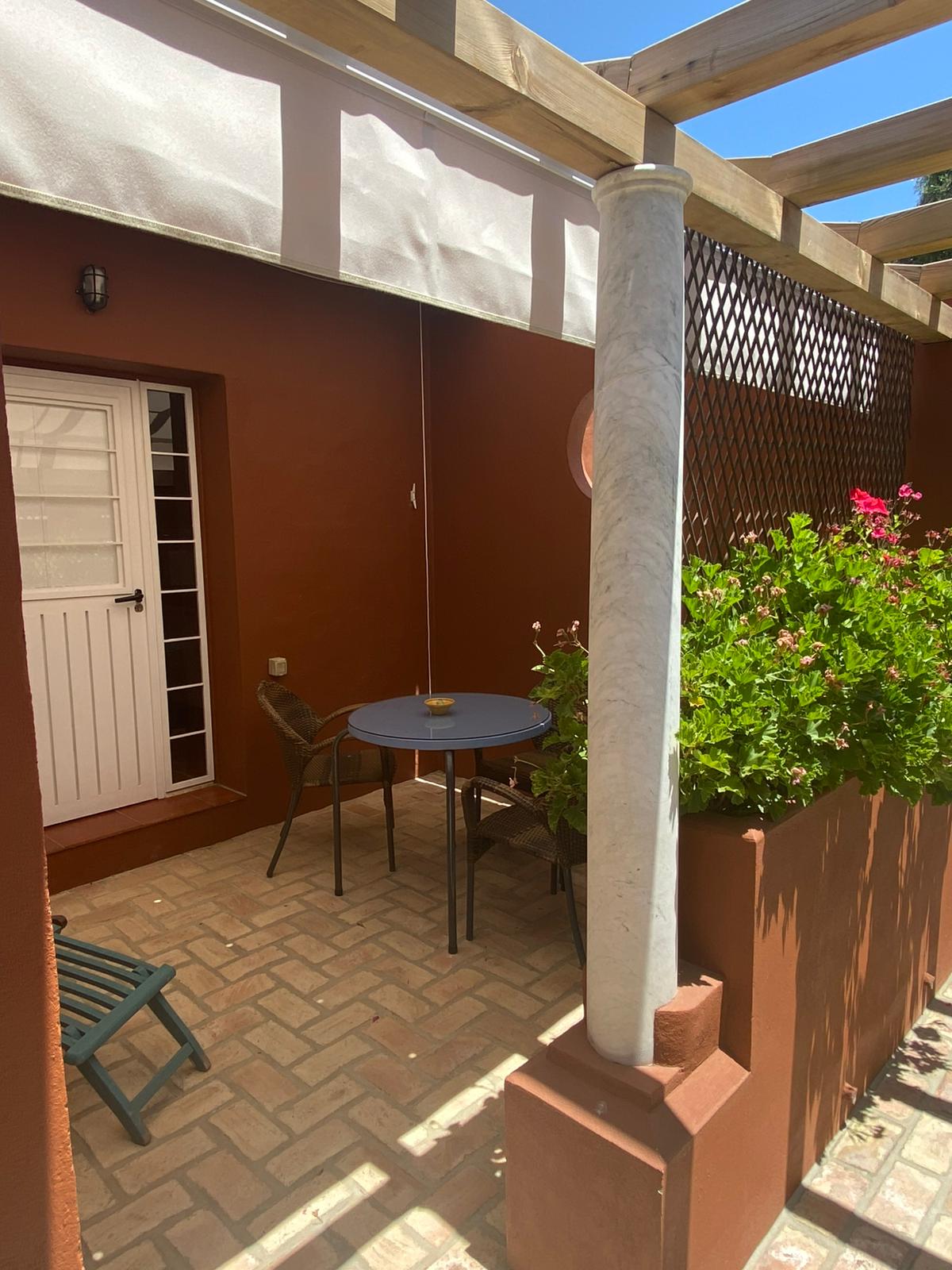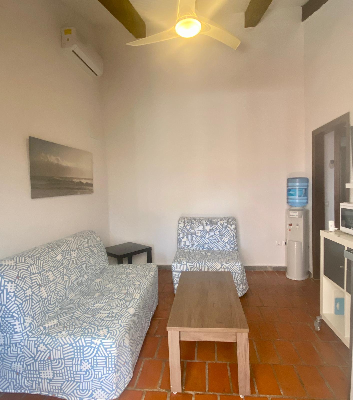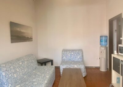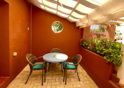 La habitación Superior cuenta con 35 metros cuadrados, dispone de entrada independiente desde la zona común y porche con mesa y sillas. Consta de un amplio dormitorio con cama de matrimonio de 1, 50 cm y armario y cómoda para la ropa. Cuarto de baño con placa de ducha. Zona de estar con sofá cama y un office con frigorifico bajo encimera en la misma estancia. Capacidad máxima para tres personas. Dispone de aire acondicionado frio/ calor, dispensador de agua mineral, televisión, WiFi, ventiladores de techo, microondas y menaje de cocina básico... Se entrega con sábanas y toallas.